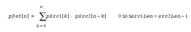 These functions perform the finite linear convolution of the pSrc1 and pSrc2 vectors. The src1Len elements of the pSrc1 vector are convolved with the src2Len elements of the pSrc2 vector. The result of the convolution is stored in the pDst vector with the length equal to src1Len+src2Len-1. The result vector pDst is calculated by the following equations: