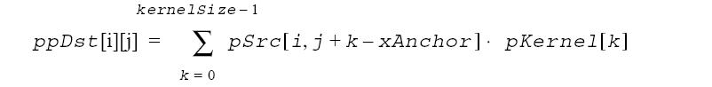 These functions apply the horizontal row filter of the separable convolution kernel to the source image pSrc. The filter coefficients are placed in the reversed order. For integer data: