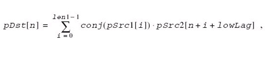 These functions calculate the cross-correlation of the pSrc1 vector and the pSrc2 vector, and store the results in the pDst vector. The result vector pDst is calculated by the following equations: