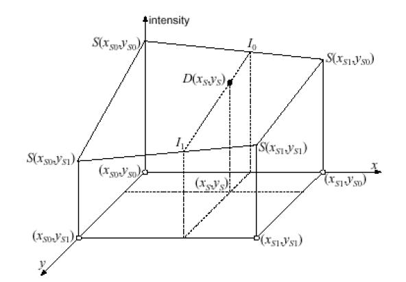 Then, the sought-for intensity D(xD, yD) is computed by interpolating the intermediate values I0 and I1 along the y-axis: