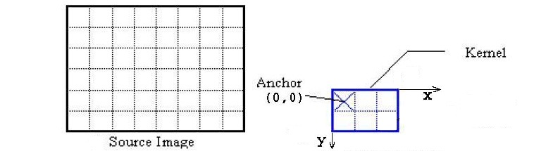 The anchor cell is a fixed cell within the kernel, which is used for positioning the kernel with respect to the currently processed pixel of the source image. The kernel is placed on the image in such a way that the anchor cell coincides with the input pixel. The anchor cell is specified by its coordinates anchor.x and anchor.y in the coordinate system associated with the top left corner of the kernel.