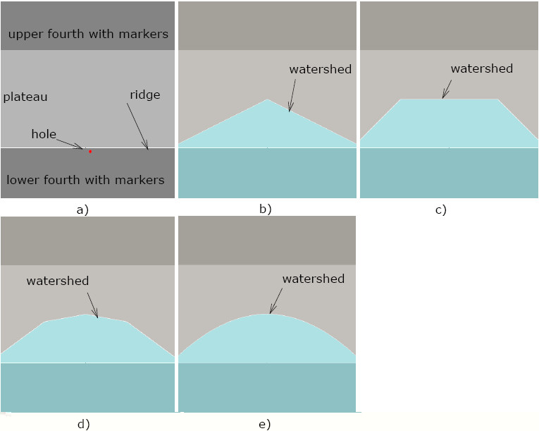 Figure “Watershed Segmentation with Different Norms” shows the plateau filling through the watershed segmentation with different values of the norm parameters. Initial image (a) has the labeled with markers upper and lower fourths with low pixel value, the central plateau between them, the ridge between the plateau and the lower forth with one pixel hole in the center of it. The following pictures are segmentation results: b) - for L1 norm (block distance), c)- Linf norm (chessboard distance), d) - approximate L2 (Euclidian) norm [Bor86], e) Fast Marching distance.