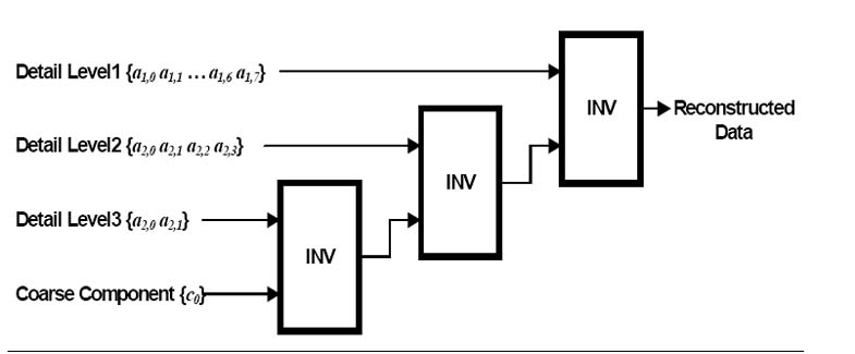 Likewise another basic element for signal reconstruction or synthesis can be defined, called the one-level inverse DWT. Figure "Three-Level Discrete Wavelet Decomposition" shows the diagram of the forward DWT which allows to switch to time-frequency representation shown in Figure above. The diagram includes three levels of decomposition. Figure "Three-Level Discrete Wavelet Reconstruction" shows the corresponding procedure of signal reconstruction based on the elementary one-level inverse transform.
