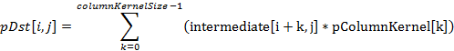 Here j = 0, ... roiSize.width - 1, i = 0,... roiSize.height - 1. The values of pixels of the source image that lies outside of the image ROI (that is, if for pixel pSrc[i,l] l ∉ [0, roiSize.width-1] are set in accordance with the specified parameters borderType and borderValue. xAnchor = (rowKernelSize - 1) / 2.