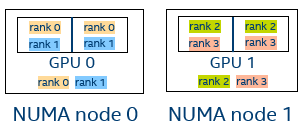 The examples below represent a machine configuration with two NUMA nodes and two GPUs with two stacks (tiles).