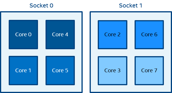 The figure above represents the SMP node model with a total of 8 cores on 2 sockets. Intel® Hyper-Threading Technology is disabled. Core pairs of the same color share the L2 cache.