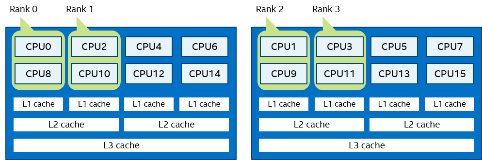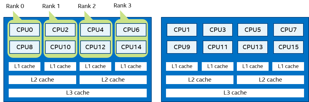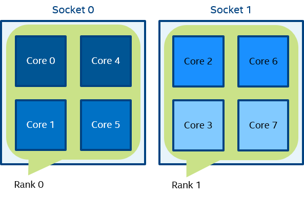 In Figure 3, two domains are defined according to the number of sockets. Process rank 0 can migrate on all cores on the 0-th socket. Process rank 1 can migrate on all cores on the first socket.