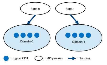 To pin OpenMP* processes or threads inside the domain, the corresponding OpenMP feature (for example, the KMP_AFFINITY environment variable for Intel® compilers) should be used.