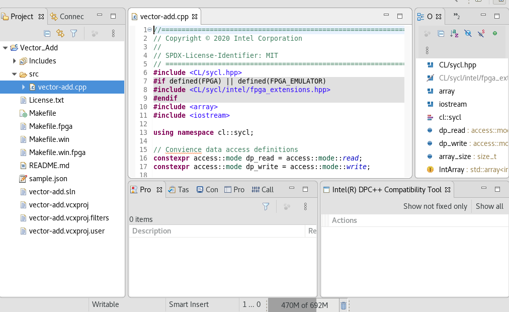 - The Vector Add sample opens in the C++ perspective and the sample will run. Check the Problems view at the bottom. If there are any errors, they will display in the Problems tab.