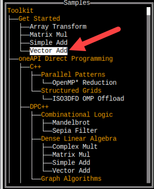 - Select the Vector Add sample. Vector Add is a simple test application that will help verify that the tools are setup correctly and can access your system's GPU: