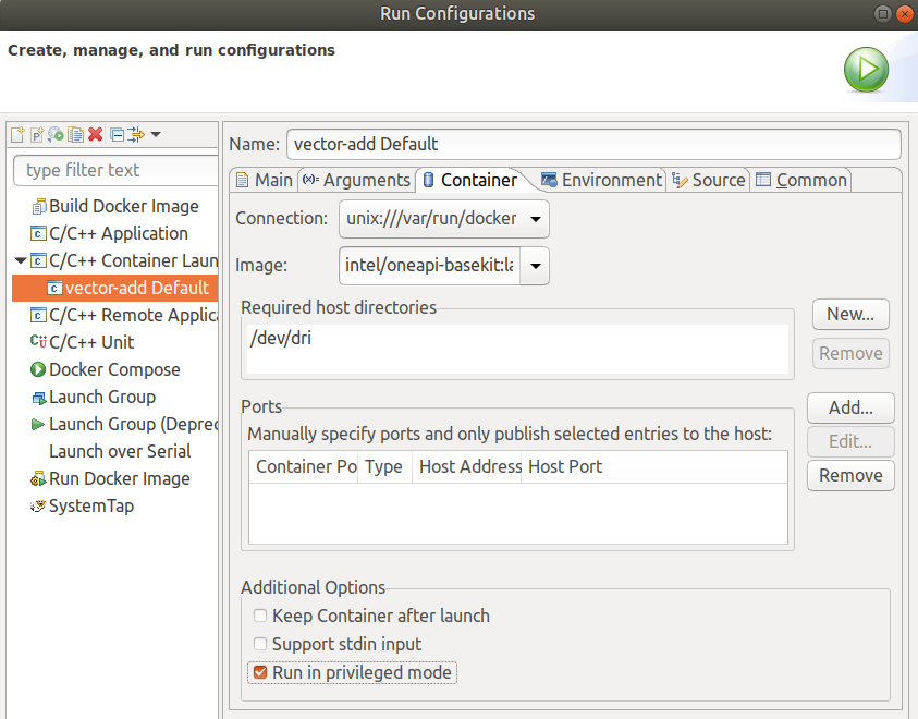 Select the Container tab and make sure the Image is set to the correct Docker image. To enable GPU in the container, add /dev/dri in the Required Host Directories and check Run in Privileged Mode.