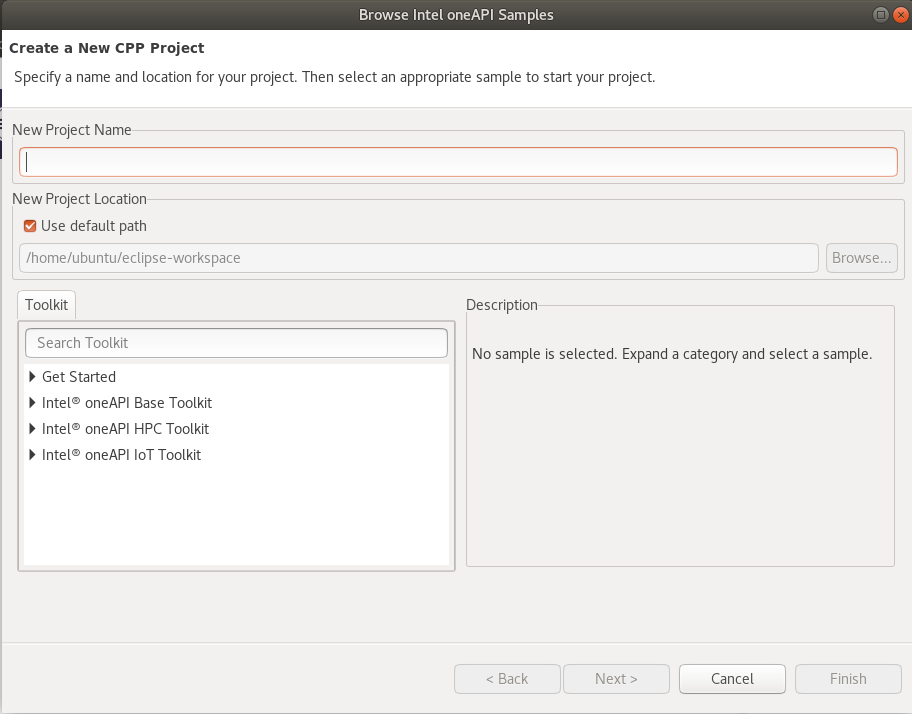 If you have installed the Intel® oneAPI Base Toolkit, you can use the Samples Browser integrated into the Eclipse IDE to create a project based on Intel® samples.