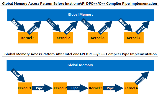 Using global memory to communicate data between your kernels can constrain the performance of your design. DPC++ pipes provide a mechanism for passing data between kernels and synchronizing kernels with high efficiency and low latency. DPC++ pipes allow kernels to use on-device FIFO buffers to communicate directly with each other. The memory model of pipes allows them to be used for inter-kernel communication without waiting for kernel completion or involvement of the host processor, as shown in the following figure: