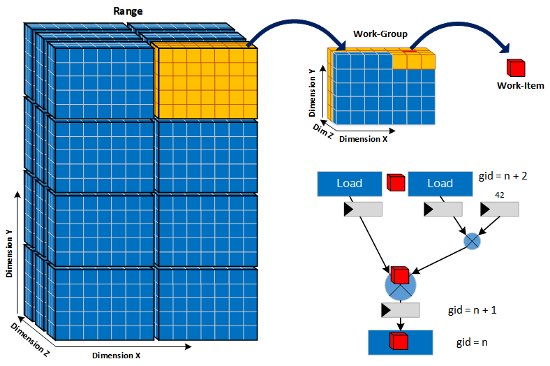 A workgroup (a range of work items) represents a large set of independent data that can be processed in parallel. Since there are no implicit dependencies between work items, at every clock cycle, the next work item can always enter kernel’s datapath before previous work items have completed, unless there is a dynamic stall in the datapath. The following figure illustrates the pipeline in Figure 1 filled with work items: