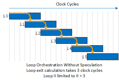 - Speculative Execution: When the critical path affecting II is the computation of the loop's exit condition and not a loop carried dependency, the Intel® oneAPI DPC++/C++ Compiler can attempt to relax this scheduling constraint by speculatively continuing to execute iterations of the loop while the exit condition is being computed. If it is determined that the exit condition is satisfied, the effects of these extra iterations are suppressed. This speculative iteration can achieve lower II and higher throughput, but it can incur additional overhead between the loop invocations (equivalent to the number of speculated iterations). A larger loop trip count helps to minimize this overhead.