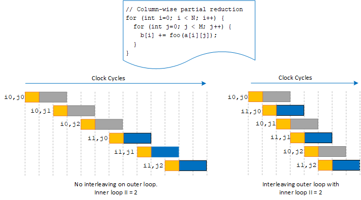 - Interleaving: When a loop nest with an inner loop II is greater than 1, the Intel® oneAPI DPC++/C++ Compiler can attempt to interleave iterations of the outer loop into iterations of the inner loop to utilize the hardware resources better and achieve higher throughput.