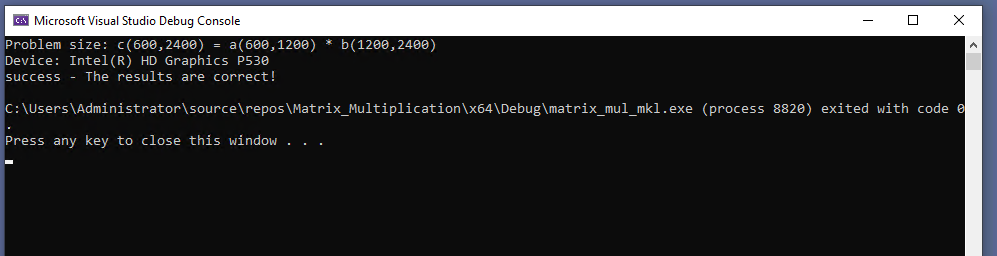 - From the Solution Explorer, right click on matrix_mul_mkl and select Rebuild.