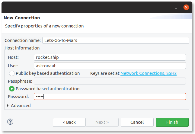 Enter your remote targets Hostname and Username. You can either use Key-based authentication or Password, depending on the configuration of the remote device.