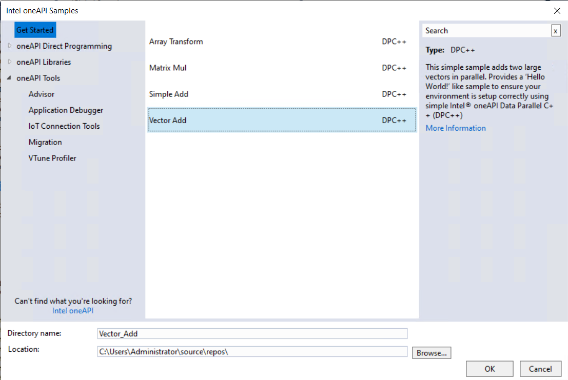 - Visual Studio 2019 and 2022: Extentions > Intel > Browse Intel oneAPI Samples