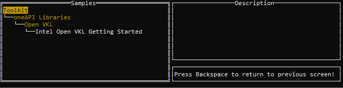 - Select the Intel Open VKL sample oneAPI Libraries > Open VKL > Intel Open VKL Getting Started: