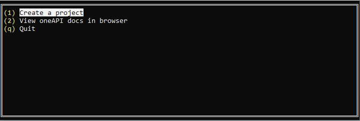 oneapi-cli -l cpp,cThe oneAPI CLI menu appears: