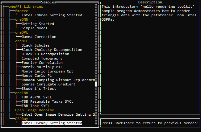 - Navigate to oneAPI Libraries > OSPRay > Intel OSPRay Getting Started, then press Enter.