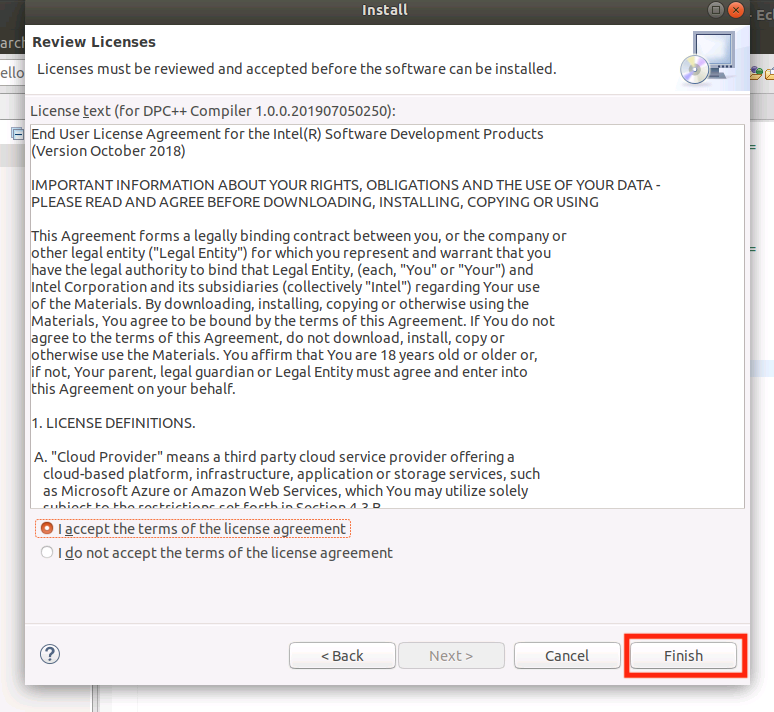 9. Review the license agreement (you must select the I accept option to proceed), and then select Finish to start installation of the plugin.