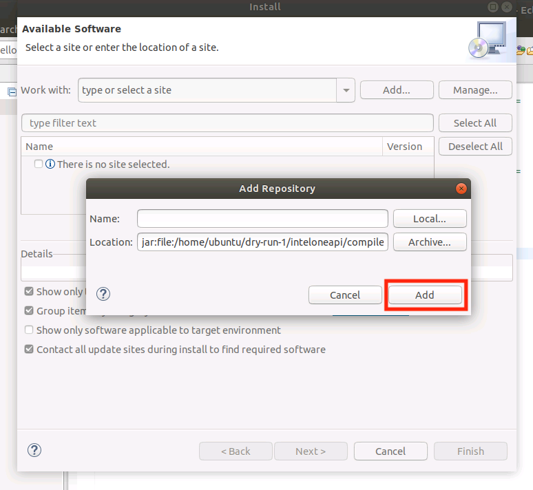 6. Select the plugin file (using the green Open button shown in the previous image), and then click the Add button in the Add Repository dialog box. The Location field should match the Eclipse plugin path and name that you identified using the file picker.