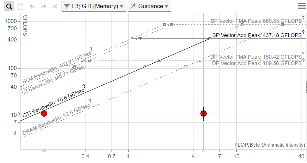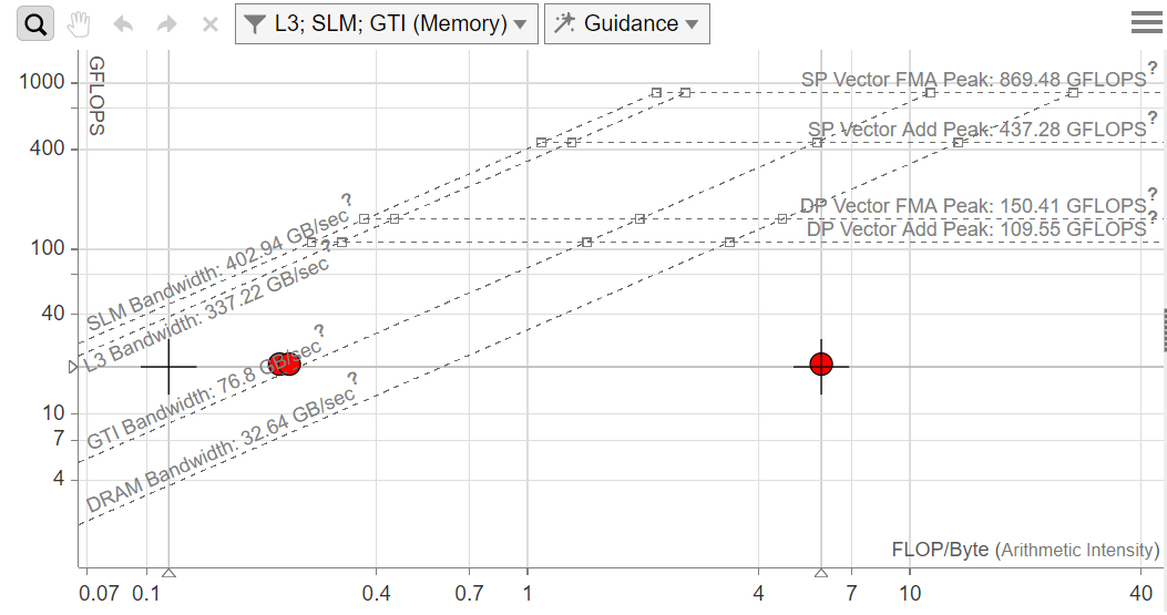 To estimate actual performance of a GPU application against hardware-imposed ceilings, you can use the GPU Roofline Insights feature. Intel® Advisor can generate a roofline model for kernels running on Intel GPUs. The GPU Roofline model offers a very efficient way to characterize your kernels and visualize how far you are from ideal performance. For details about the GPU Roofline, see the Intel Advisor User Guide.