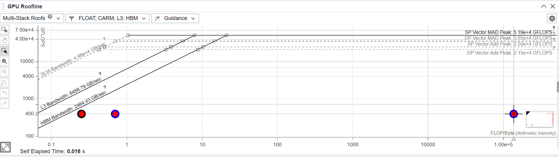 To estimate actual performance of a GPU application against hardware-imposed ceilings, you can use the GPU Roofline Insights feature. Intel® Advisor can generate a roofline model for kernels running on Intel GPUs. The GPU Roofline model offers a very efficient way to characterize your kernels and visualize how far you are from ideal performance. For details about the GPU Roofline, see the Intel Advisor User Guide.