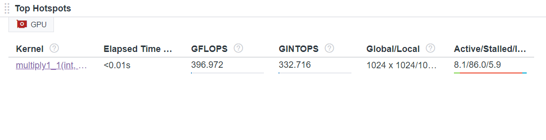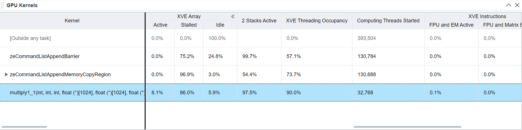 See how efficiently your application uses execution units for each GPU Kernel in the GPU Kernels pane. Clicking on a top hotspot in the Top Hotspot will show the XVE usage in GPU Kernels pane.