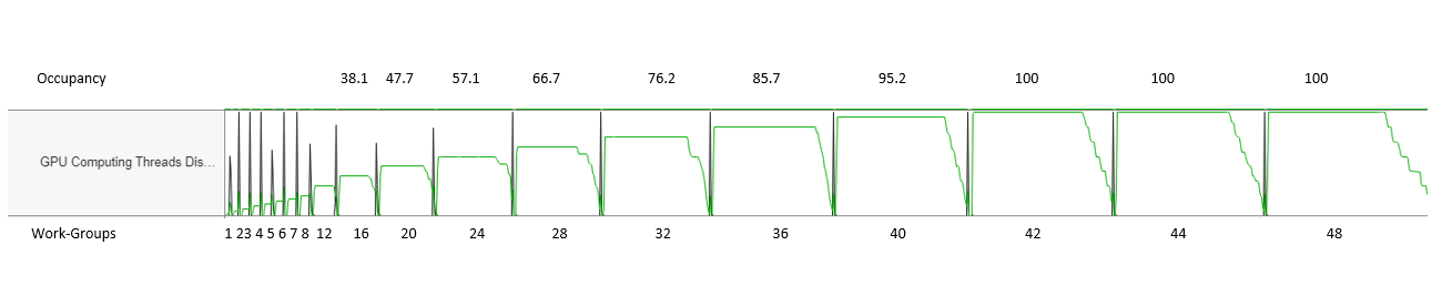 The following timeline view gives the occupancy over a period of time. Note that the occupancy metric is accurate for a large part of the kernel execution and tapers off towards the end, due to the varying times at which each of the threads finish their execution.