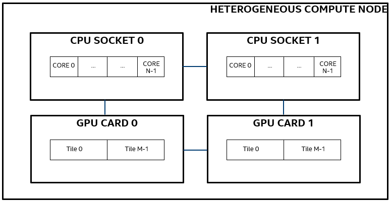 The below figure illustrates a typical GPU compute node, with two CPU sockets. Each CPU socket has N cores and is connected to a single GPU card with M stacks, making a total of 2M stacks per node.