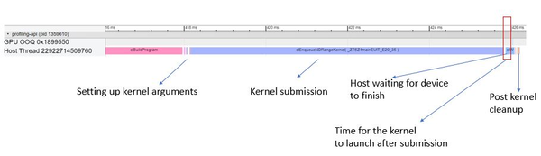 The following picture is the zoomed in version to show the detail of the functions called on the host side to submit the kernel. Here the time is dominated by the clEnqueueNDRangeKernel. Also notice that there is a lag between the completion of kernel submission on the host and the actual launch of the kernel on the device.