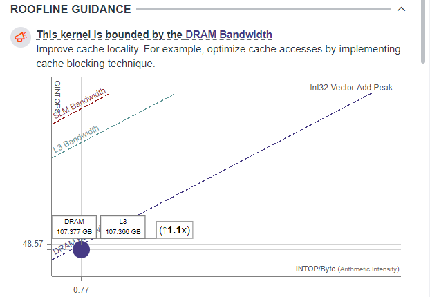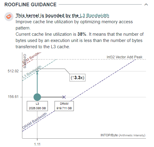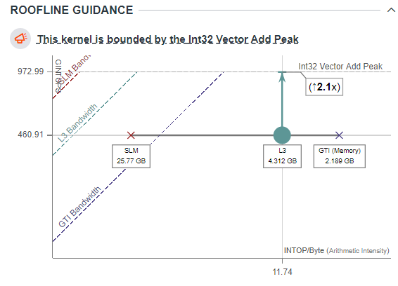 As the Roofline Guidance chart shows, the kernel performance is limited by the Int32 Vector operations, which are the operations that the compiler used to implement the code. The chart indicates that the kernel can be optimized to run 2.1x faster.