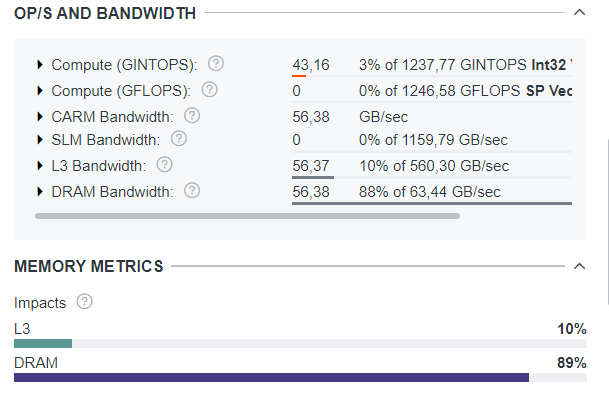 As the OP/S and Bandwidth pane shows, the L2 and SLM bandwidth are far from their limits. The kernel performance has increased to 47% of its theoretical limit of integer operations per second (INTOPS).