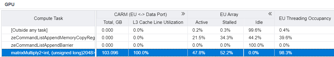 The theoretical SLM bandwidth is almost 3x times higher than the L2 cache bandwidth, but the SLM is not used in this implementation. Blocking matrix arrays to use them as local shared data can eliminate the L2 cache bandwidth limits.