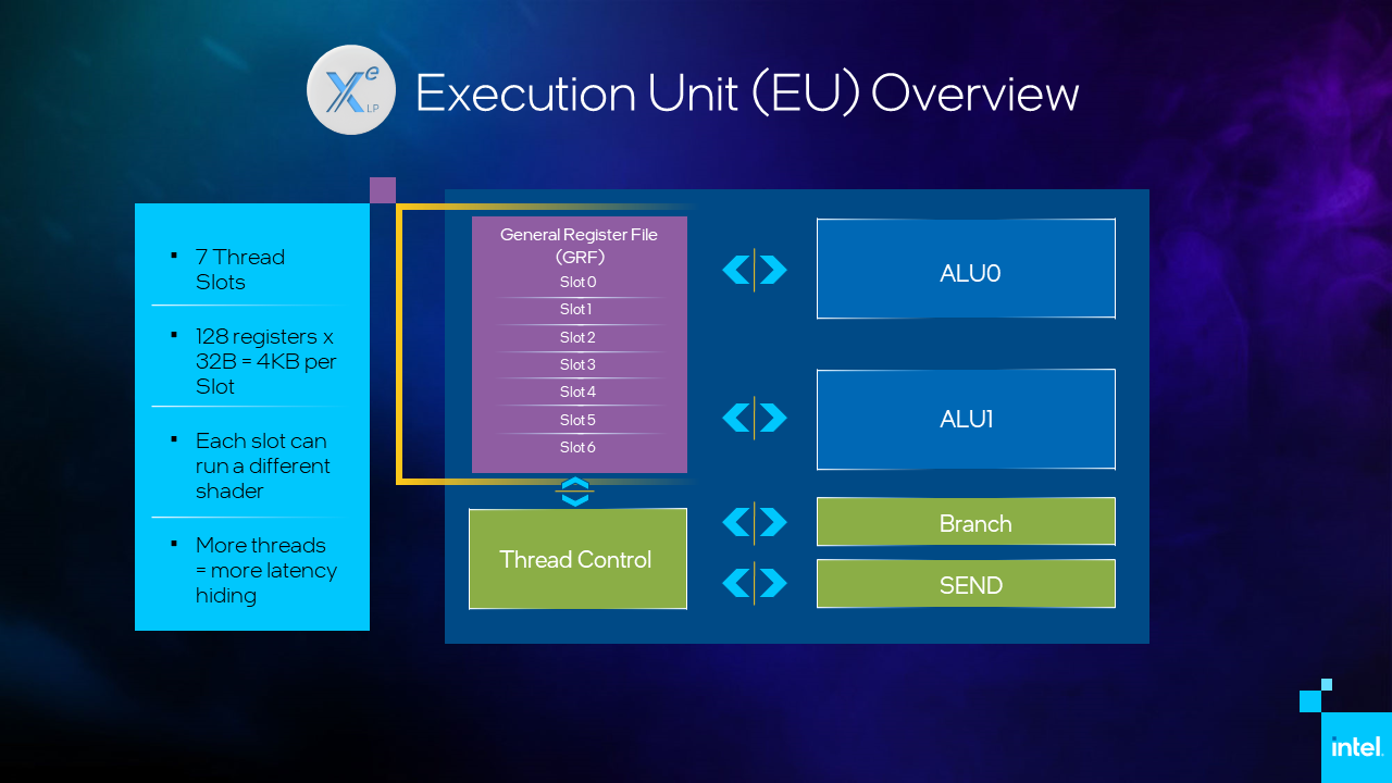 On an integrated GPU, where DRAM is shared between CPU and GPU, global data can travel form system DRAM through last-level cache (LLC) to a graphics technology interface (GTI) on a GPU. If data is efficiently reused, it can stay in the L2 cache of a GPU where execution units can access it and fetch to an Xe Vector Engine (XVE) register file.