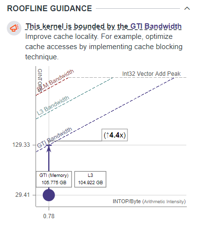 The Roofline Guidance chart shows that the kernels are GTI Bandwidth bound, not DRAM bound as the main Roofline chart suggests. The reason for it is that Intel Advisor cannot measure the bandwidth for data transferred between DRAM and XVE on integrated GPUs due to hardware limitations.