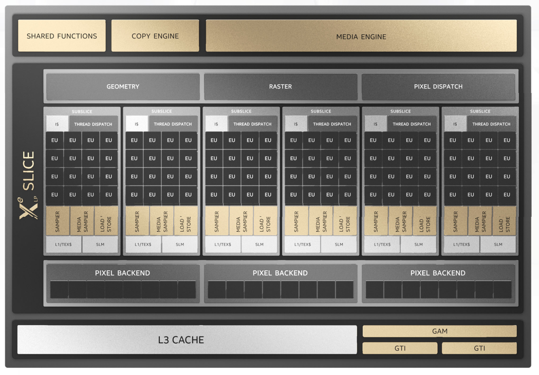 Each Xe-LP slice consists of six (dual) subslices for a total of 96 EUs, up to 16MB L2 cache, 128B/cycle bandwidth to L2 and 128B/cycle bandwidth to memory.