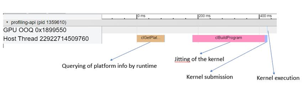 The following picture shows the timeline of the execution for the above example. This picture is generated from running clIntercept to generate a trace file and using Chrome* tracing to visualize the timeline. In this timeline there are two swim lanes, one for the host side and another for the device side. Notice that the only activity on the device side is the execution of the submitted kernel. A significant amount of work is done on the host side to get the kernel prepared for execution. In this case, since the kernel is very small, total execution time is dominated by the JIT compilation of the kernel, which is the block labeled clBuildProgram in the figure below.