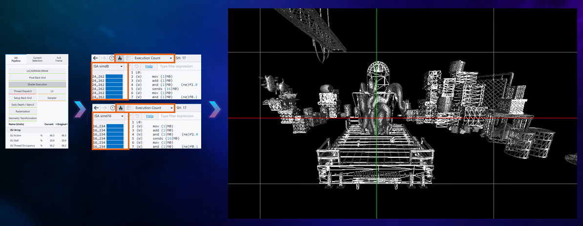 Open Shader Profiler, but in Execution Count mode rather than Duration mode which shows how many times each instruction was executed. In Fig x notice that the pixel shader has been compiled into both SIMD8 and SIMD16. Shader Profiler shows that each instruction in the SIMD8 version was executed 24,000 times, while instructions in SIMD16 were executed 16,000 times - a 1.5 times difference!