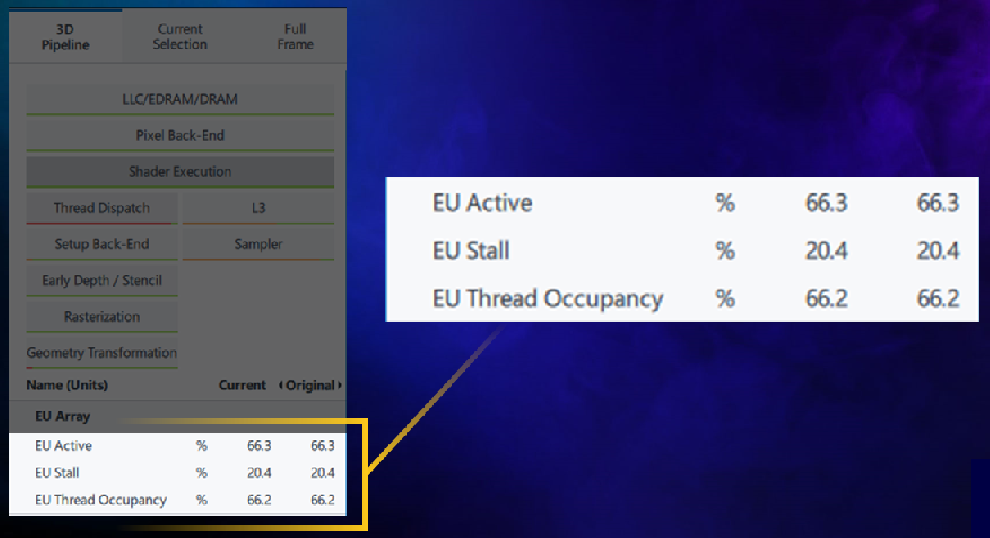 In Graphics Frame Analyzer, if you are running on Xe-LP or earlier architecture, you will see EU Active, EU Stall and EU Throughput data labels. On newer architecture you will see XVE Active, XVE Stall and XVE Throughput data labels. Here we use Xe-LP as our reference architecture, thus we will refer to the EU. But understand that whether it is the EU or the XVE, the Stall/Active/Throughput relationships affect performance in the same ways.