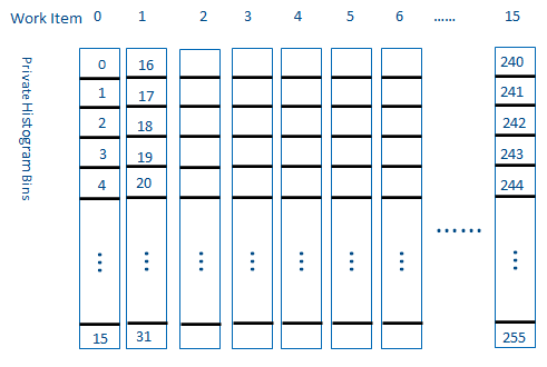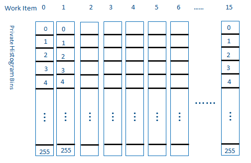 If the number of histogram bins gets larger than, for example, 1024, there will not be enough register space for private bins even the private bins are shared in the same sub-group. To reduce memory traffic, the local histogram bins can be allocated in the shared local memory and shared by work items in the same work-group. Refer to the “Shared Local Memory” chapter and see how it is done in the histogram example there.