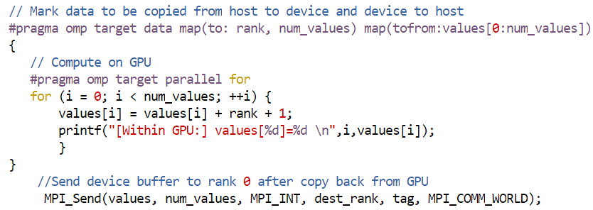 Please note that MPI_Send appears outside the scope of both offload pragmas in the previous figure. Both SYCL and OpenMP offload constructs may be used for the required data movements between the host and device.