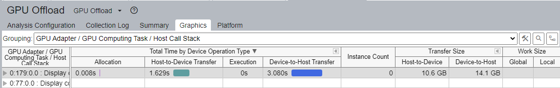 To see the amount of data transferred between host and device one may use Intel® VTune™ Profiler’s GPU Offload analysis. Here Host-to-Device and Device-to-Host transfer times and transfer volumes are visible under the Graphics tab, as shown in the next figure. The following command line was used for running the GPU Offload analysis: