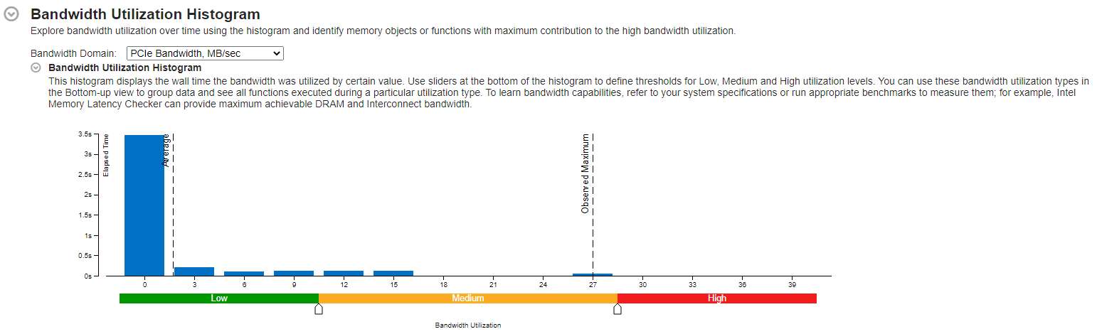 As can be observed from the Bandwidth Utilization Histogram in the Summary tab of the Input and Output Analysis (following figures), PCIe traffic is significantly higher in the case where the MPI buffers were allocated on the device. The observed maximum bandwidth in the -mem_alloc_type device case was 24,020 MB/s versus 27 MB/s for the CPU buffer case.