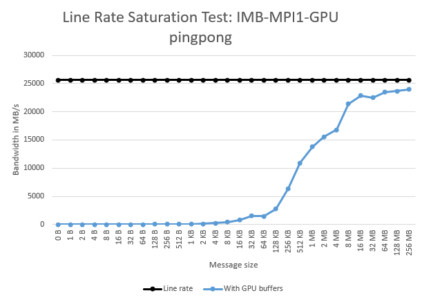 In this sub-section we demonstrate Intel® MPI Library’s ability to saturate the interconnect bandwidth when GPU buffers are employed. Tests were run on two nodes, each with a dual socket Intel® Xeon® Platinum 8480+ processor and 2 Intel® Data Center GPU Max 1550 (Code name: Ponte Vecchio). The nodes were connected using Mellanox Quantum HDR interconnect which is rated at 200 Gb/s or 25 GB/s. A total of 2 MPI ranks were launched, i.e. 1 rank per node and the PingPong test was selected from the IMB-MPI1-GPU binary as shown in the following command: