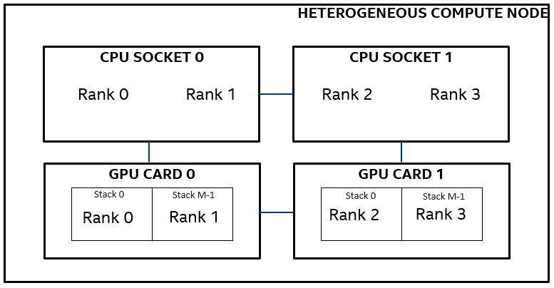 The figure below illustrates a typical GPU compute node, with two CPU sockets. Each CPU socket has N cores and is connected to a single GPU card with M stacks, making a total of 2N cores and 2M stacks per node.