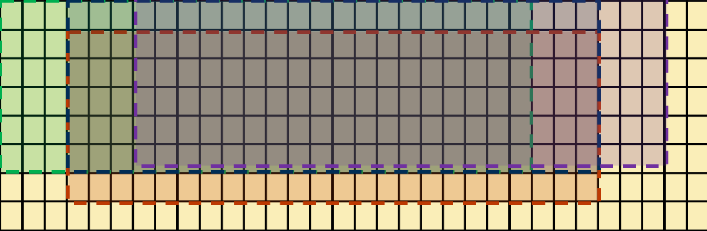 Each thread in the ESIMD kernel reads an 8x32-byte matrix and outputs a 6x24-byte matrix corresponding to 6x8 pixels. Although we only need 8x30 bytes for 8x10 input pixels, adding two-byte padding to each row gives a good layout in register file for computation. The select operation acts as follows: after the input pixels are loaded into the 8x32-byte matrix, at each step, we extract a 6x24-byte sub-matrix through a select operation, convert all elements into float, then add them to the running total, which is a 6x24-floating matrix “m”. The implementation essentially performs a sliding window averaging calculation, as illustrated by the picture below, where each rectangle with dashed border represents a sub block selected for accumulating the intermediate results in m. The media block load and store functions are used to read an 8x32 2D block from the input image and write a 6x24 2D block to the output image respectively, which are more efficient than SIMT gather/scatter functions.